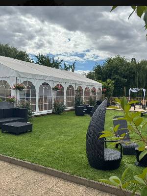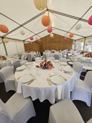 Sous une grande tente lumineuse aux allures bohèmes, vos convives profitent d’une atmosphère conviviale et chaleureuse. Le jardin soigneusement aménagé, orné de palmiers et de fleurs colorées, crée un décor unique qui invite à la détente et à la fête.