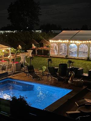 L’espace dispose également d’une belle piscine mise en valeur par des éclairages nocturnes, parfaite pour sublimer vos soirées d’été et offrir un cadre original à vos réceptions.
